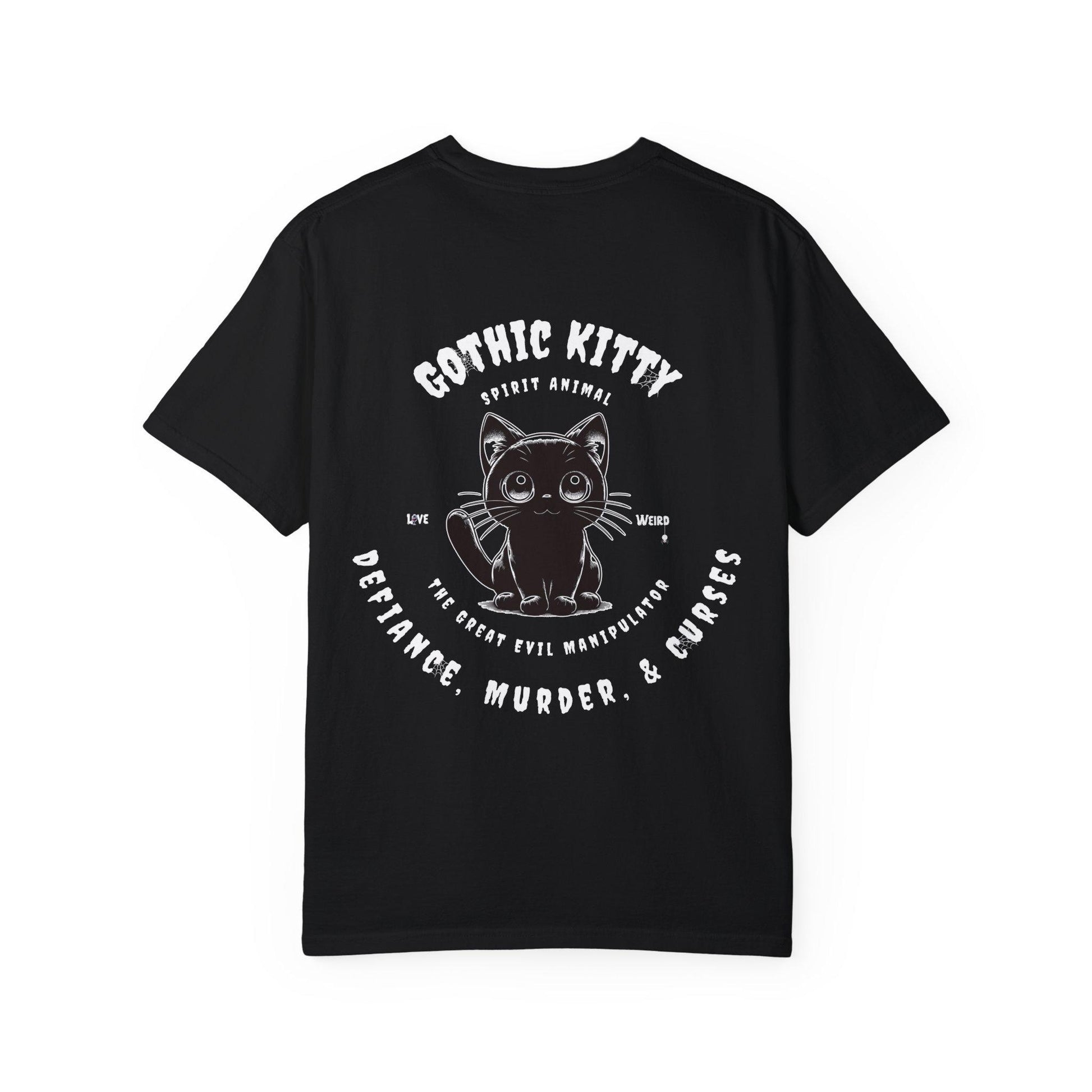 Express your love for all things gothic with this gothic cat spirit animal T-shirt. The garment-dyed fabric gives it a soft color and texture, perfect for adding a touch of edge to your wardrobe. This tee is ideal for those who appreciate alternative style and want to stand out from the crowd. It's great for casual wear or for making a statement at a Halloween party.