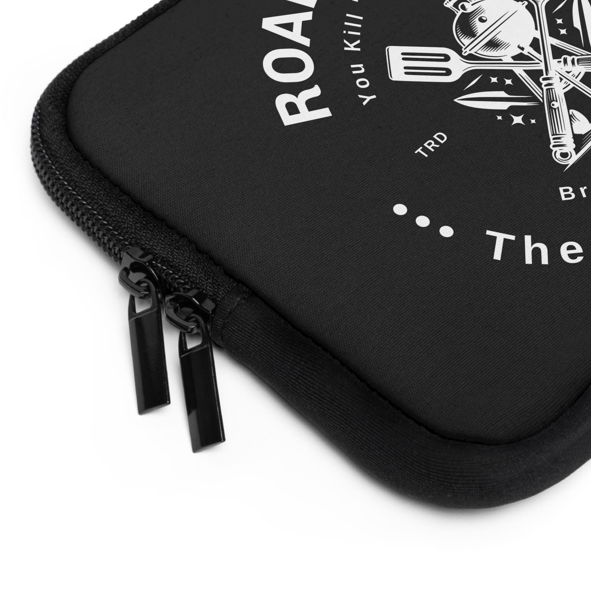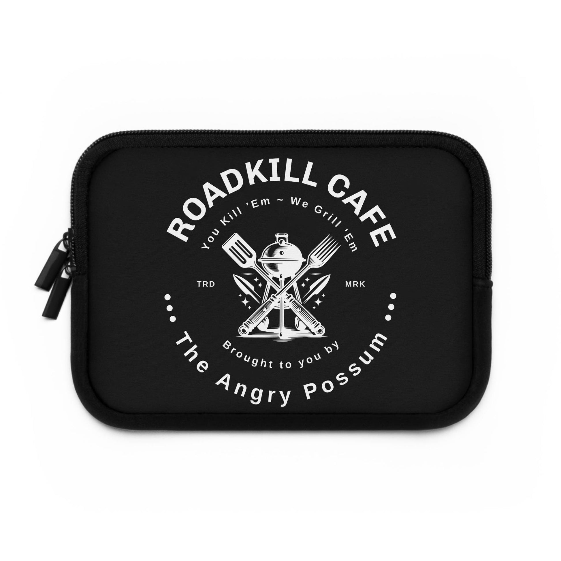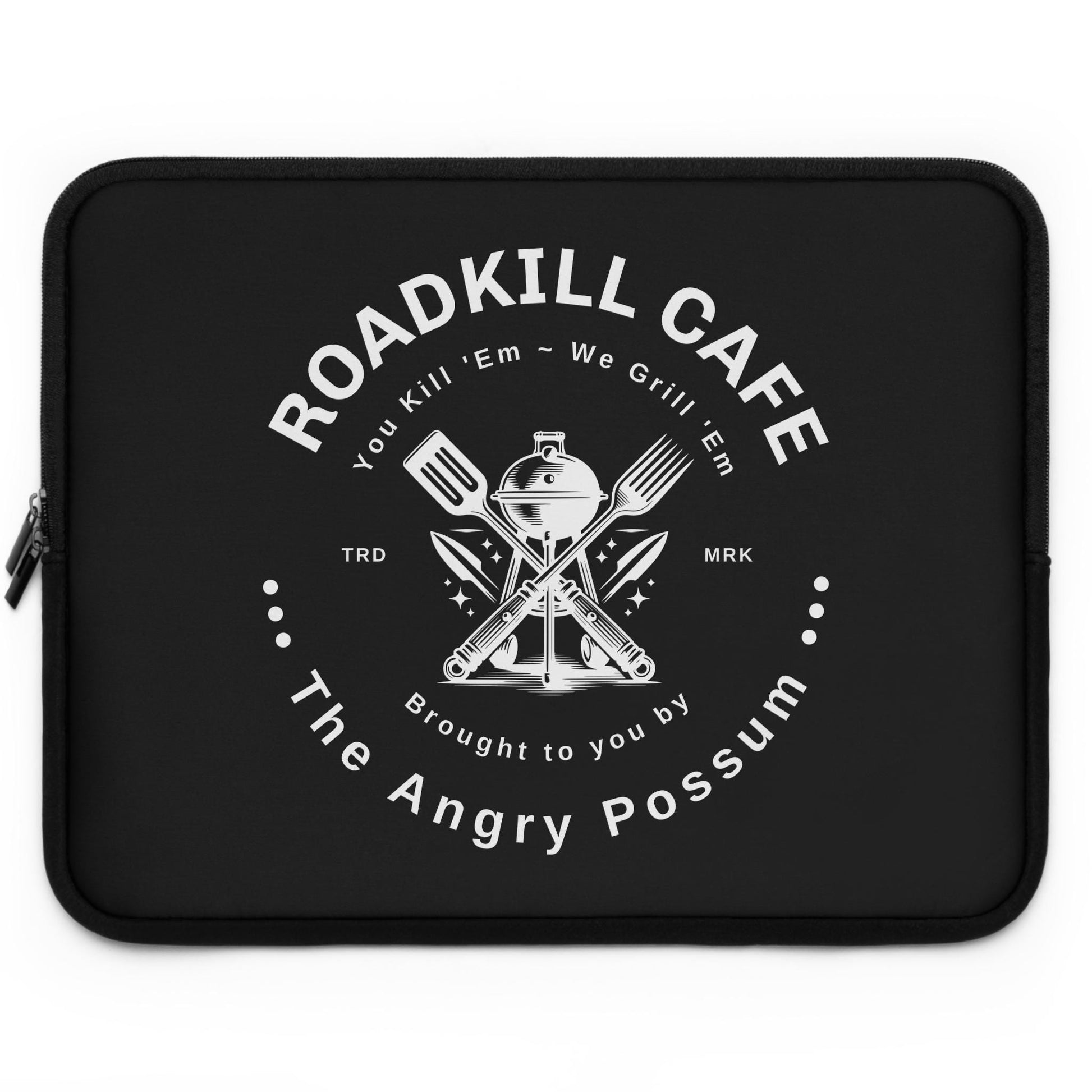 A quirky and unique Laptop Sleeve featuring a 'roadkill cafe brought to you by the angry possum' design. This sleeve adds a touch of humor and personality to your work or school essentials. Perfect for animal lovers and those who enjoy a bit of dark humor. Ideal for back to school, office professionals, and casual laptop users.